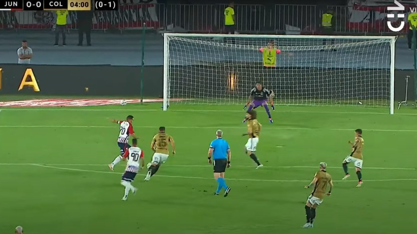Pareció llegar el 2-0 de Colo Colo sobre Bucaramanga a los '79, pero tras la revisión del VAR, la jugada de Cepeda fue anulada pues estuvo adelantado en su entrada al área y la cuenta vuelve a estar 1-0.
