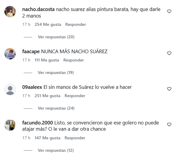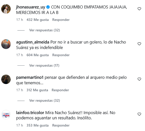 “Merecemos ir a la B”, “me arruinaron el día” o “traigan un portero”, fueron solamente algunos de los comentarios de los aficionados en el Instagram del club.