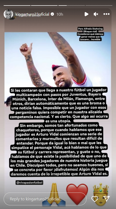 Posteriormente, el texto escrito por un hincha indica que "somos tan afortunados como chaqueteros. Porque cuando hablamos que ese jugador es Arturo Vidal comienzan una serie de comentarios y murmullos que resultan difícil de entender".