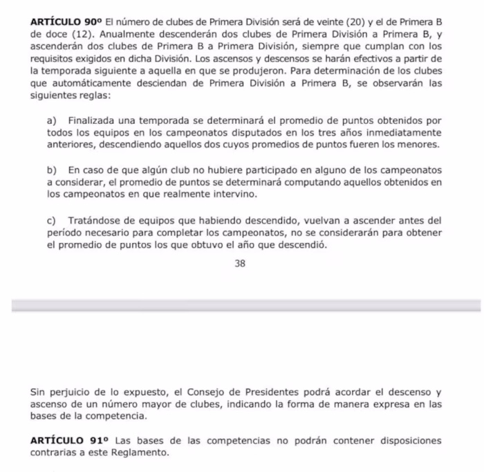 Sin embargo, la segunda instancia establece en su artículo 90° que la baja a la Primera B se definirá por el promedio de puntos en las últimas tres temporadas, algo que se instaló en el regreso del torneo post estallido social y pandemia.