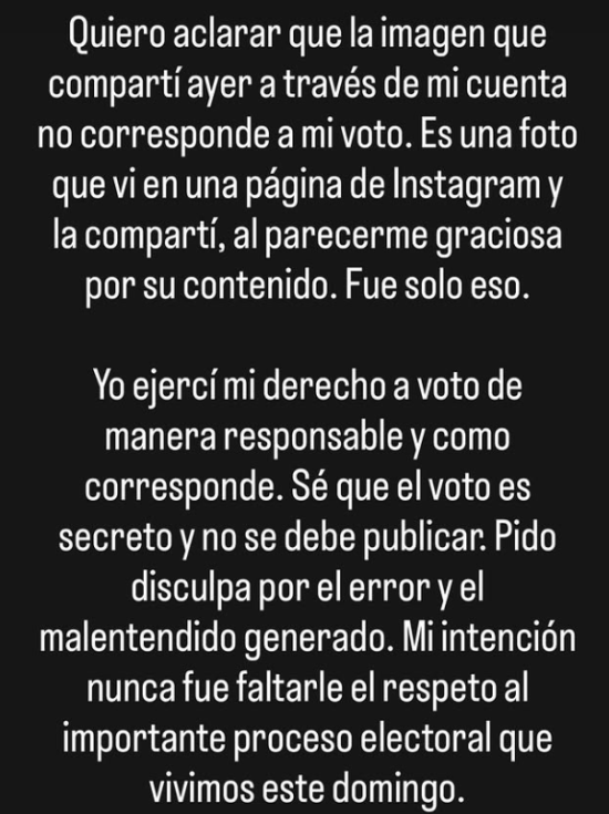 A raíz del ruido que generó la situación, Pavez pidió disculpas por lo ocurrido y aclaró que "la imagen que compartí a través de mi cuenta no corresponde a mi voto".