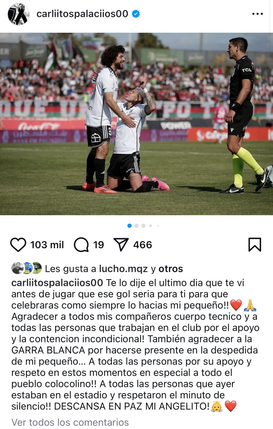 Tras dedicarle un gol en el triunfo de Colo Colo ante Palestino, Carlos Palacios escribió emotivas palabras para su sobrino, quien perdió la vida en un trágico accidente el pasado fin de semana.