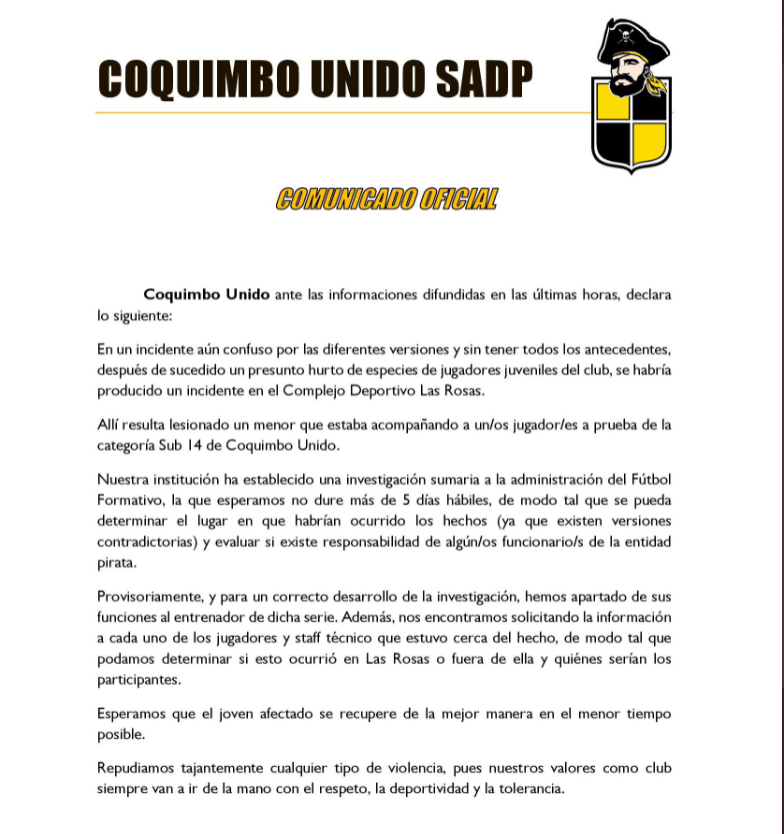 Coquimbo Unido informó a través de un comunicado el despido de un entrenador del fútbol formativo, luego de que este no interviniera en una golpiza que sus jugadores le estaban propinando a un menor de edad en el centro de entrenamiento.