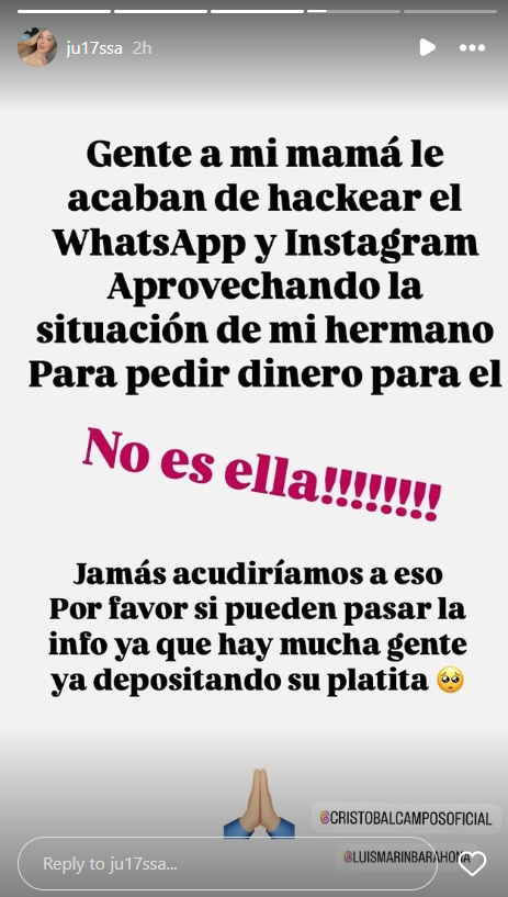 "A mi mamá le acaban de hackear el WhatsApp e Instagram aprovechando la situación de mi hermano para pedir dinero para él", contó.