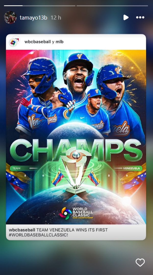 Bianneider Tamayo, jugador de Universidad de Chile, celebró el histórico triunfo de Venezuela ante Estados Unidos en la final del Clásico Mundial de Béisbol.