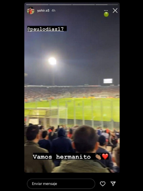Sin embargo, durante las últimas horas apareció una storie de Instagram de Yahir Salazar, defensa de 17 años que se desempeña en las inferiores de la U. El juvenil estaba presente en el Monumental apoyando a Paulo Díaz, defensa chileno del cual es cercano.