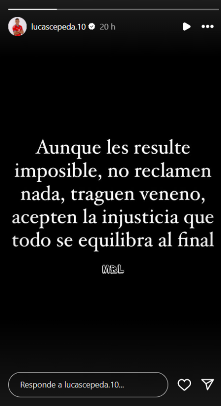 En una historia de Instagram, el extremo señaló: "Aunque les resulte imposible, no reclamen nada. Traguen veneno, acepten la injusticia que todo se equilibra al final".