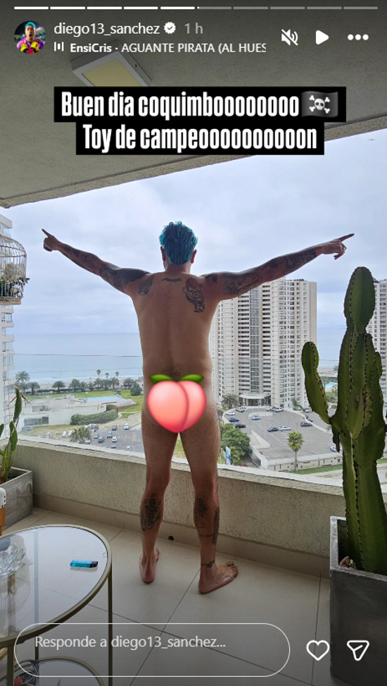 "Buen día Coquimbo. Estoy de campeón", escribió el guardameta en una historia de Instagram, agregando una foto desnudo en la que tapó sus partes íntimas con un emoji.