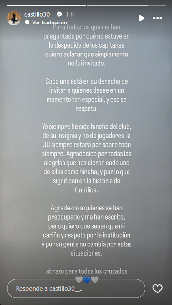 Ante las reiteradas consultas de los hinchas, Nicolás Castillo explicó los motivos por los que no asistió al partido "Adiós Capitanes" de José Pedro Fuenzalida, Cristián Álvarez y Milovan Mirosevic.