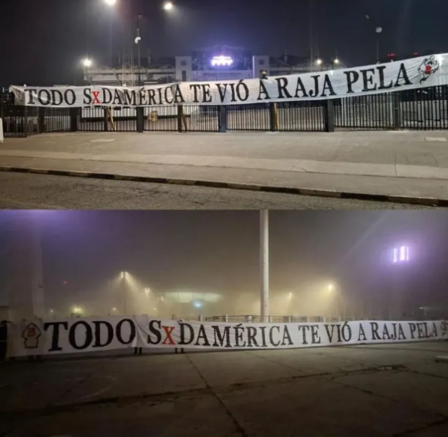 En uno de los accesos del Estadio Monumental, un grupo mostró un trapo que contenía el mensaje: "Todo Sudamérica te vio correr a ra... pelá".