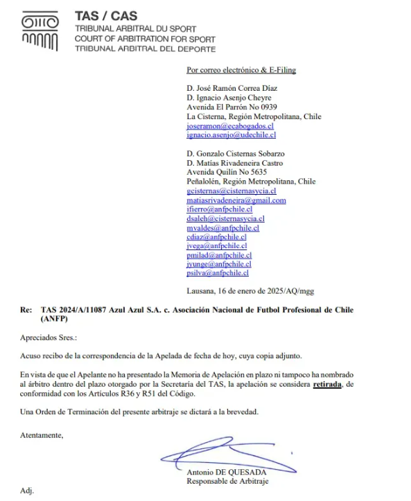 La resolución fue comunicada a través de una carta dirigida a José Ramón Correa e Ignacio Asenjo, miembros de Azul Azul.