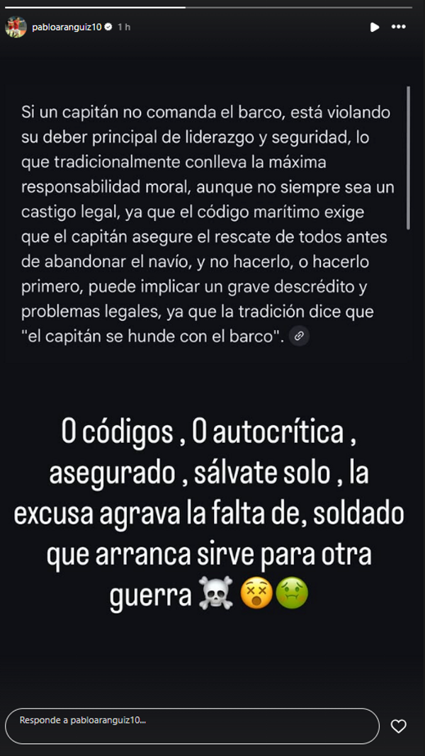 Tras las declaraciones, Aránguiz contestó con una historia de Instagram en la que apuntó al capitán de un barco, sin mencionar directamente al DT.