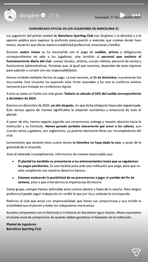 El último posteo en redes sociales del jugador es una denuncia contra su propia institución, acusando que la dirigencia no había pagado el sueldo del plantel.