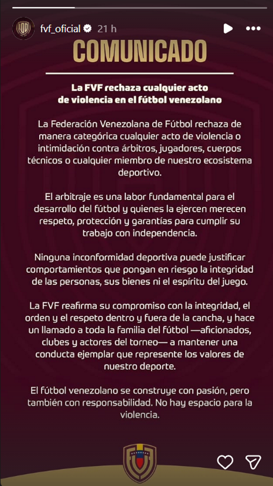 El caso fue condenado por la Federación Venezolana de Fútbol (FVF), quienes rechazaron "cualquier acto de violencia o intimidación contra árbitros, jugadores, cuerpos técnicos o miembros de nuestro ecosistema deportivo".