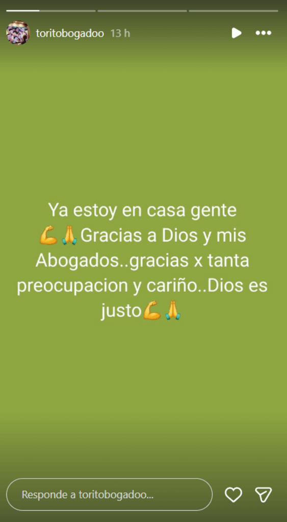 “Ya estoy en casa gente. Gracias a Dios y mis abogados. Gracias por tante preocupación y cariño. Dios es justo”, escribió en una historia de Instagram.