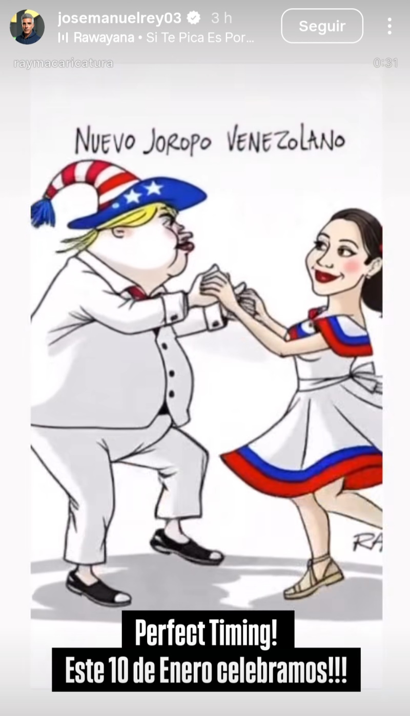 Rey compartió una historia de Instagram una caricatura del presidente norteamericano Donald Trump bailando joropo, la danza típica de Venezuela.