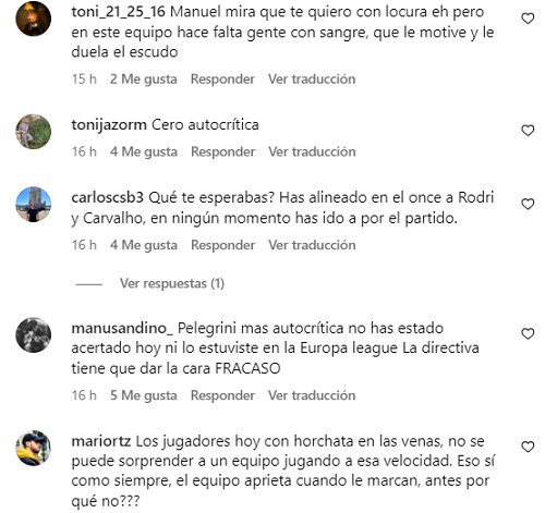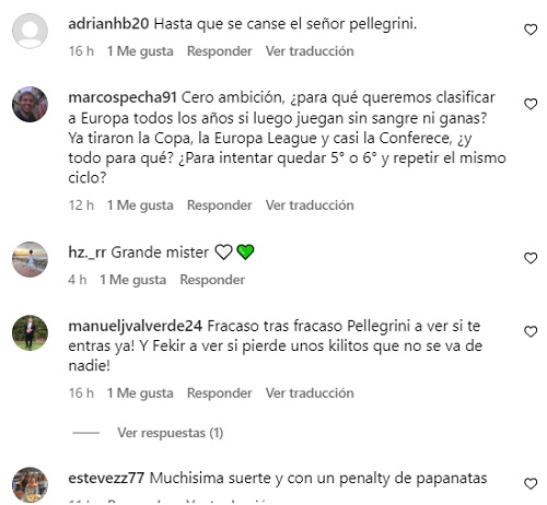 Pese a las numerosas bajas, los hinchas del Real Betis fueron muy duros con Pellegrini y lo acusaron de tener "poca autocrítica".