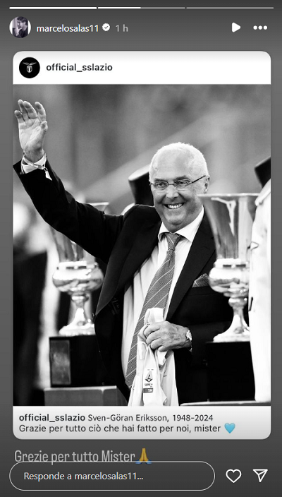 Marcelo Salas no ocultó su tristeza por el deceso de Sven-Göran Eriksson, su ex DT en la Lazio de Italia que perdió la vida tras una dura lucha contra el cáncer de páncreas.
