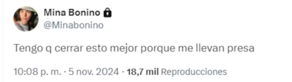 En su cuenta de X (ex Twitter) Bonino lanzó en primer término: "Tengo que cerrar esto porque me llevan presa", lo que llevó a que un usuario le argumentara que se trataba de un "cambio táctico".