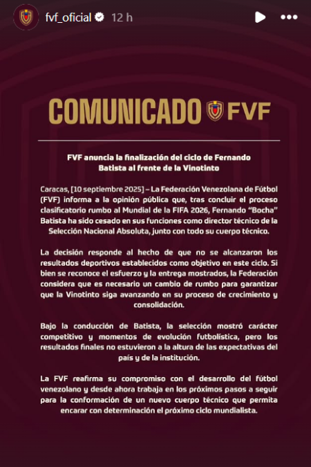 Luego de la frustración de no haber podido acceder al repechaje para el Mundial 2026, Venezuela confirmó la salida de su entrenador Fernando "Bocha" Batista.