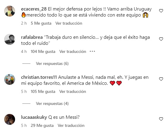 El gran partido de Cáceres hizo que los hinchas uruguayos repletaran de comentarios el Instagram del defensa de 24 años.