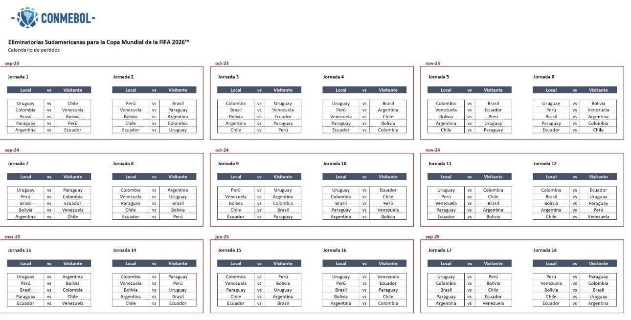 Con el Mundial de Qatar 2022 en el pasado, la Conmebol oficializó el calendario para un nuevo proceso de cara a la próxima cita planetaria, la que se desarrollará en Norteamérica el 2026. Los partidos comenzarán en septiembre de este 2023 y se extenderán hasta septiembre del 2025, con tres fechas dobles por año.