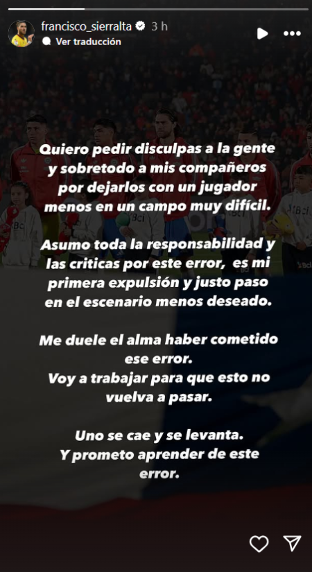 En una historia de Instagram, Sierralta comentó: "Asumo toda la responsabilidad y las críticas por este error. Es primera expulsión y justo pasó en el escenario menos deseado".
