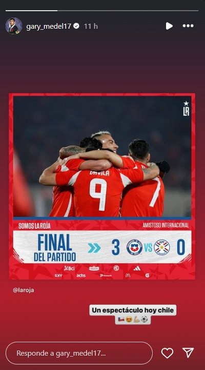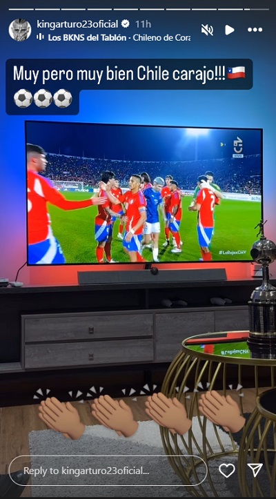 En tanto, el King también subió una historia con aplausos y el mensaje: "Muy, pero muy bien Chile carajo", festejando los goles de Víctor Dávila y Eduardo Vargas.