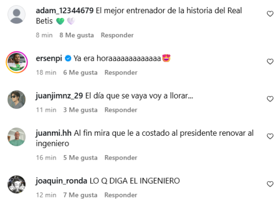 El Instagram del Real Betis se repletó de comentarios luego del anuncio de renovación de Manuel Pellegrini, quien se quedará en el club hasta el 2027.