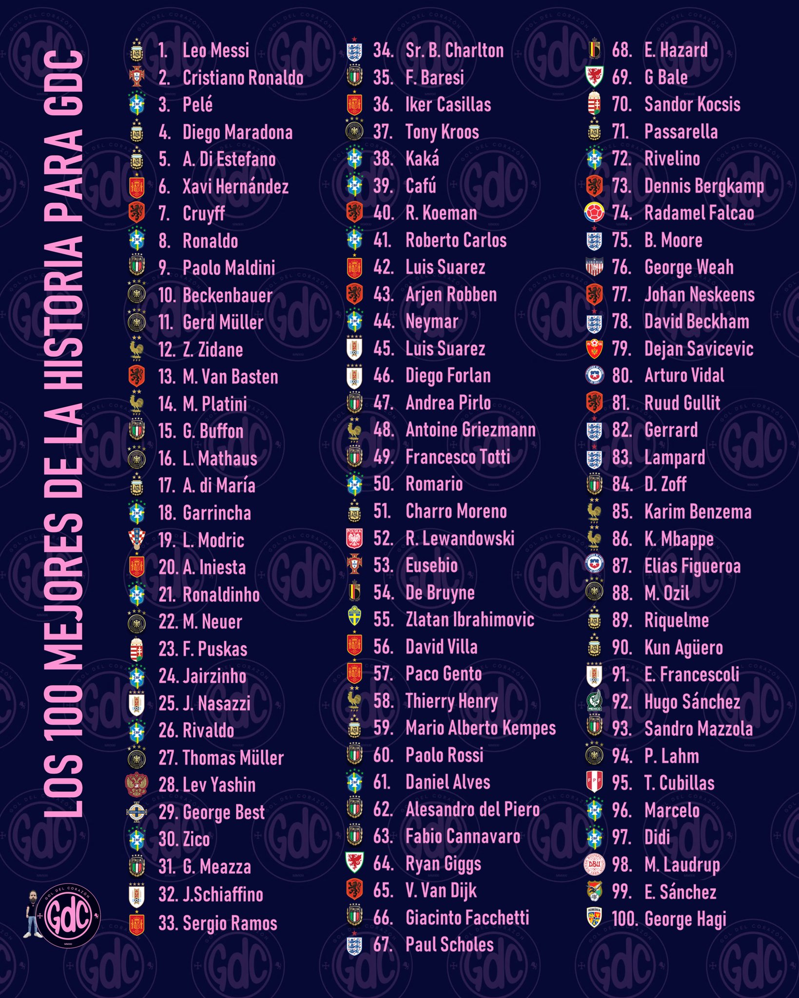 El más trascendente de todos los tiempos, al menos para GDC, es Messi, seguido por CR7, Pelé y Maradona, mientras que Alfredo Di Stéfano cierra el Top 5°.