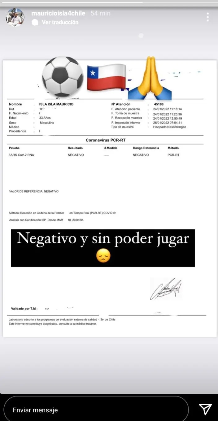 Sin embargo, el caso de Isla sufrió un vuelco esta tarde, cuando el lateral del Flamengo publicó en sus historias de Instagram el resultado de un nuevo PCR realizado hoy, en el cual se lee "negativo". En la storie Isla comparte su lamento: "PCR negativo y sin poder jugar".