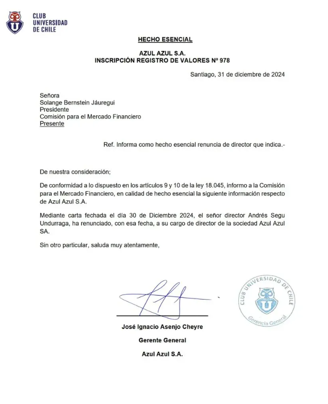 "Mediante carta fechada el día 30 de diciembre de 2024, el señor director Andrés Segú Undurraga ha renunciado, con esa fecha, a su cargo de director de la sociedad Azul Azul S.A", detalla la carta.