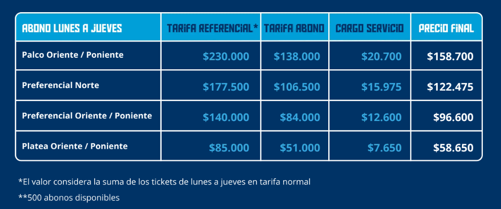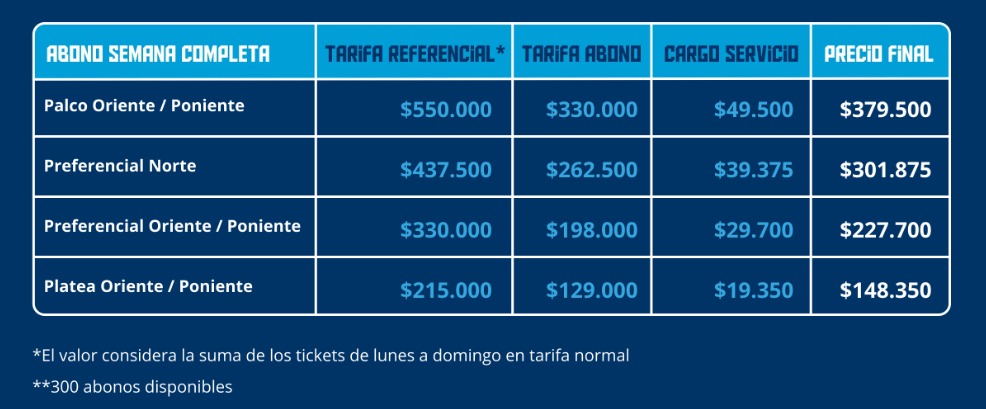 La organización dispuso dos opciones para adquirir el abono: El de la semana completa (lunes a domingo) o solamente el de lunes a jueves.