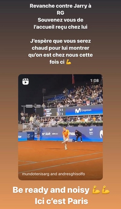 El tenista de 25 años subió una historia en la que aseguró que tendrá "revancha contra Jarry en Roland Garros. Recuerdo bien la bienvenida que me dieron en su casa (Chile Open)".