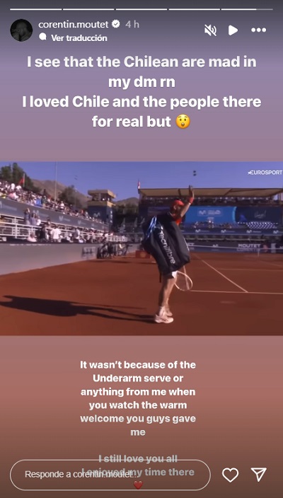 A través de su cuenta de Instagram, Corentin Moutet calentó el partido contra Nicolás Jarry por Roland Garros con dos picantes mensajes, donde recordó la actitud del público en el Chile Open.