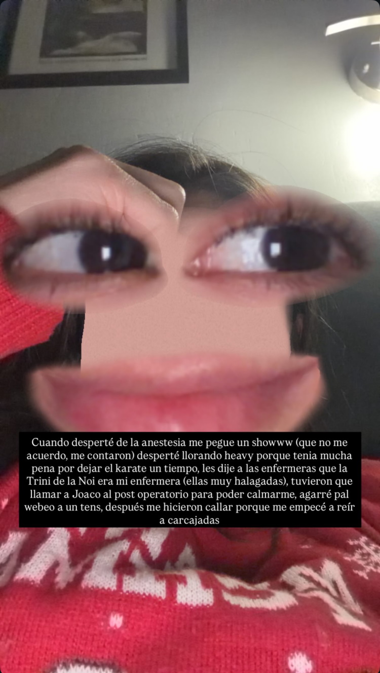 "Desperté llorando heavy porque tenía mucha pena por dejar el karate un tiempo. Les dije a las enfermeras que Trinidad de la Noi era mi enfermera (ellas muy halagadas)", agregó.