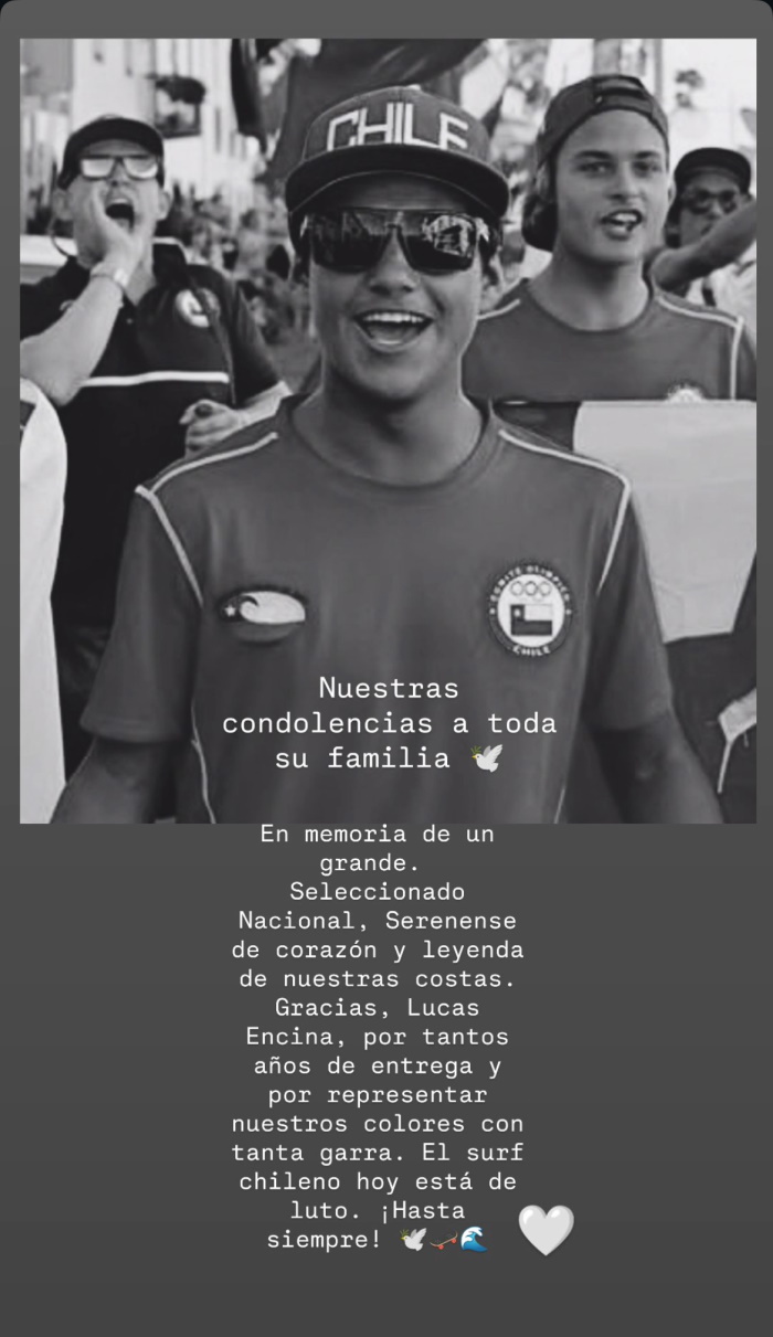 La entidad agradeció a Encina "por tantos años de entrega y por representar nuestros colores con tanta garra. El surf chileno hoy está de luto. Hasta siempre".