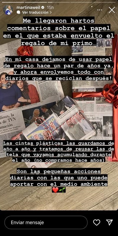 “Me llegaron hartos comentarios sobre el papel en el que estaba envuelto el regalo de mi primo. En mi casa dejamos de usar papel de regalo hace un par de años ya, y ahora envolvemos todo con diarios que se reciclan después", dijo en una historia subida a sus redes sociales.