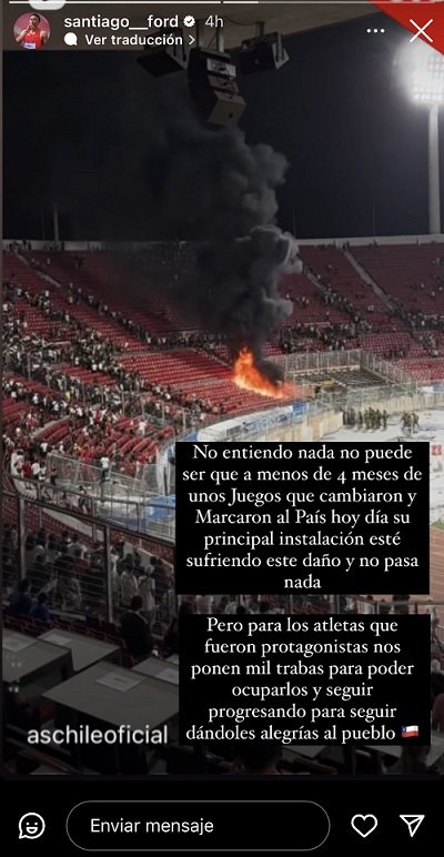 El atleta y medallista de oro en los Juegos Panamericanos Santiago 2023, Santiago Ford, se manifestó en sus redes sociales luego de los incidentes ocurridos en la Supercopa que jugaron este domingo Colo Colo y Huachipato.