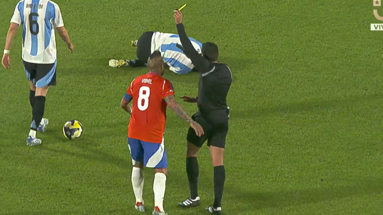El King fue con todo sobre el volante argentino cerca de la mitad de la cancha. La tarjeta amarilla le impide estar en el duelo de La Roja contra Bolivia por Eliminatorias.