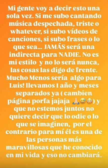 "No es mi estilo y no lo será nunca, las cosas las digo de frente. Mucho menos sería algo para Luis, llevamos un año y meses separados. Cambien la página porfa", agregó.