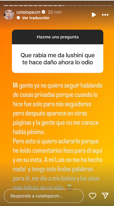 En una historia, López le respondió a un usuario que acusó al ex futbolista de hacerle "daño", ante lo que la modelo nacional replicó: "Mi gente, yo no quiero seguir hablando de cosas privadas".