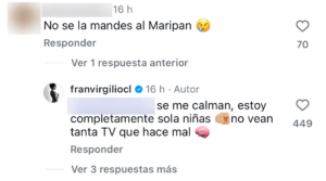 Virgilio no lo dejó pasar y contestó: “Se me calman, estoy completamente sola niñas. No vean tanta TV que hace mal”.