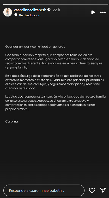 Pérez subió a sus historias de Instagram un comunicado en el que señaló: "Con todo el cariño y respeto que siempre nos ha unido, quiero compartir con ustedes que Igor y yo hemos tomado la decisión de seguir caminos diferentes hace unos meses".
