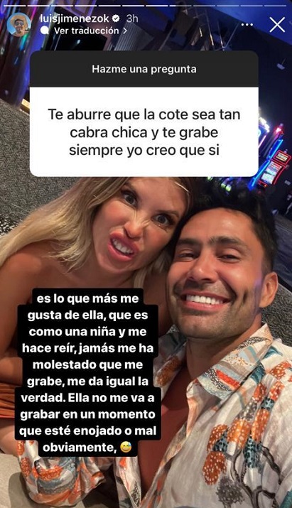 En ese sentido, una persona le planteó una llamativa duda a Jiménez sobre su pareja: "¿Te aburre que la Coté sea tan cabra chica y te grabe siempre? Yo creo que sí".