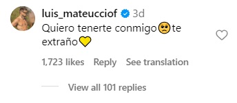 Ante esto, el argentino reaccionó al posteo con un coqueto comentario: "Quiero tenerte conmigo. Te extraño", contestó Luis Mateucci en un comentario que no tardó en viralizarse.