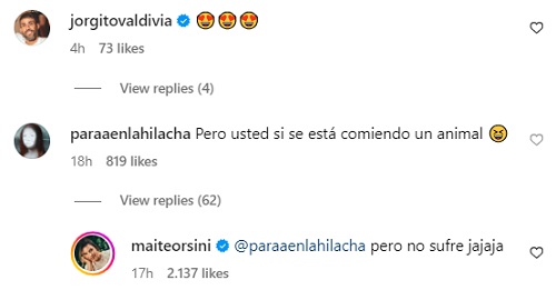El posteo de Orsini provocó que una usuaria le hiciera un inesperado comentario sobre su pareja. “Pero usted si se está comiendo un animal”, dijo la seguidora por su relación con Valdivia.