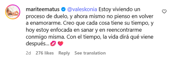 Ante eso, Marité contestó: "Estoy viviendo un proceso de duelo, y ahora mismo no pienso en volver a enamorarme. Creo que cada cosa tiene su tiempo, y hoy estoy enfocada en sanar y en reencontrarme conmigo misma".