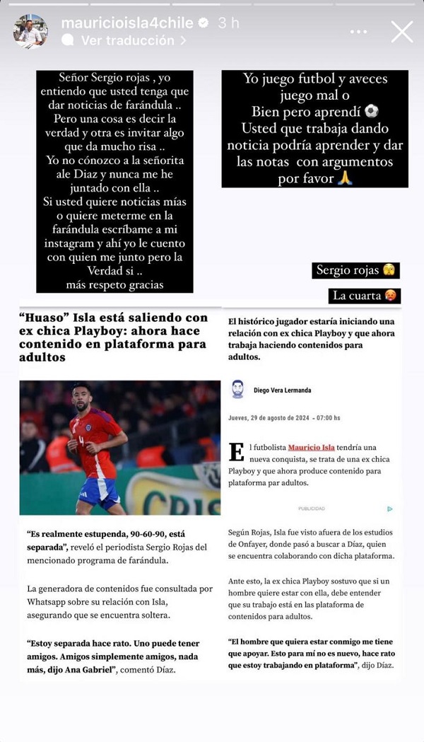 Ante nuevos rumores de romance, Mauricio Isla se expresó a través de su Instagram y descartó tener un vínculo con la modelo Alejandra Díaz. "No conozco a la señorita", señaló.