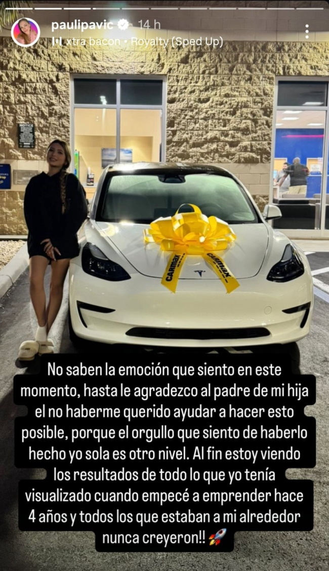 En una historia de Instagram, Pavic escribió: No saben la emoción que siento en este momento; hasta le agradezco al padre de mi hija por no querer ayudar, porque eso hizo posible que lograra esto por mí misma".